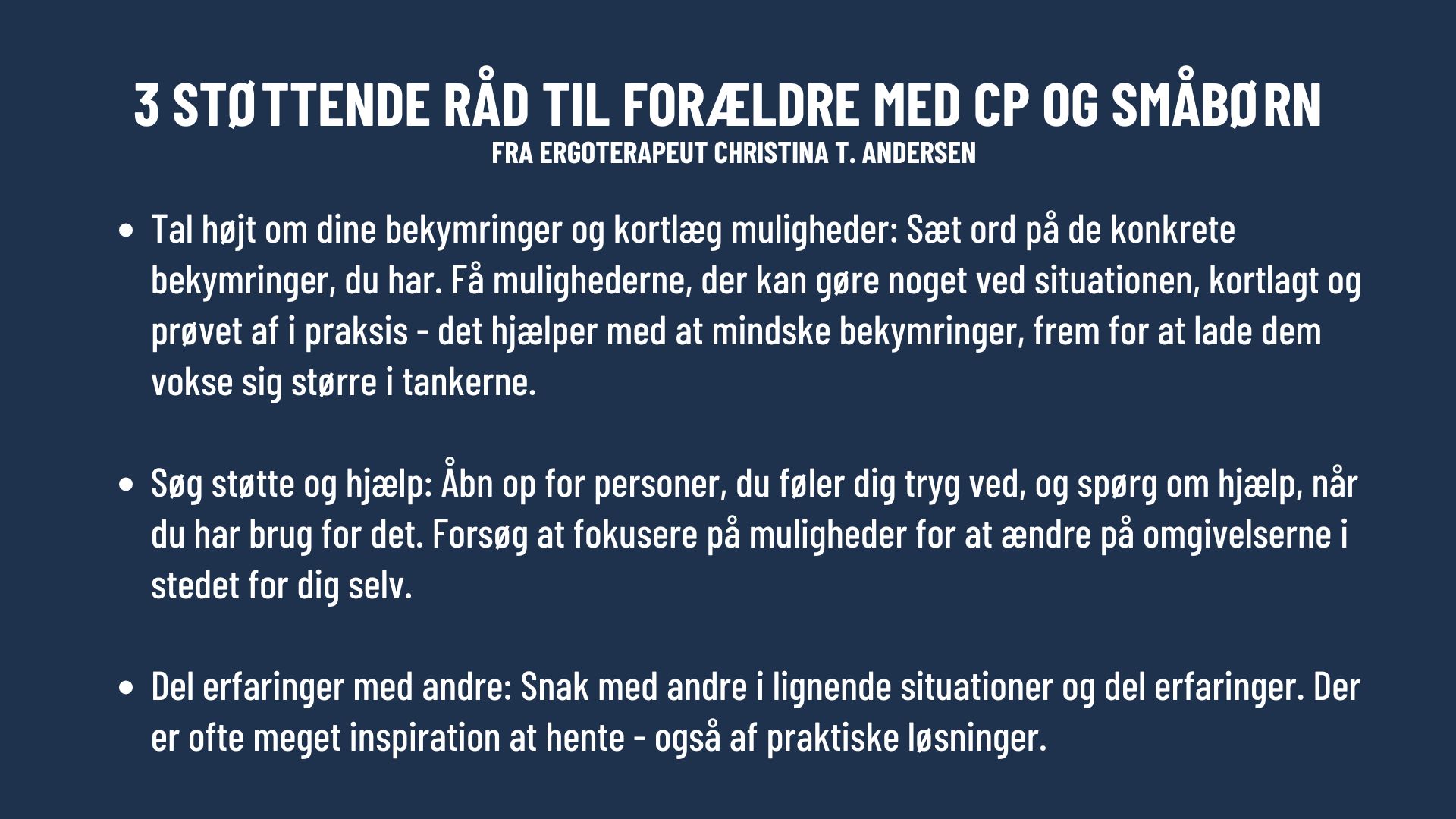 Som Sigrid påpeger, er livet med småbørn energikrævende. For omkring halvdelen af alle med cerebral parese er øget træthed dog allerede en del af hverdagen, og derfor er det også en af de mest udbredte bekymringer og udfordringer, som Christina T. Andersen møder hos forældre med cerebral parese – både før barnet bliver født og i tiden efter.